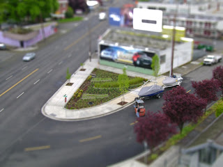 Portland landscape architect extraordinare Dave Elkin, offers this take on City Shrinking, noted in the Landscape Urbanism year-end review... This photo of Portland's Sandy Green Street Project in miniature uses the techniques outlined by Ben Thomas in this Adobe Design Center interview, so you too can wield the power. I have yet to try but Dave swears it was a simple Photoshop process... seeing is almost believing.