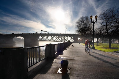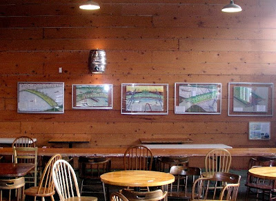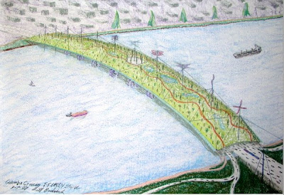 On a different local note, an installation by local Bill Badrick that is on display right now at the Northwest Portland location of the Lucky Lab Brewpub is a vision of the Columbia River Crossing - sheathed in rooftop green. Bill writes: "...The concept is to put a park roof on the proposed freeway bridge over the Columbia River [below]. The Park Roof protects drivers/walkers/bikers from the fierce winter storms , controls runoff , and mostly eliminates expensive re-painting. Imagine a picnic at 200' above the river with a panorama from Mt St Helens to Mt Hood!"